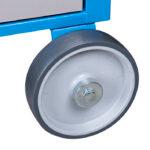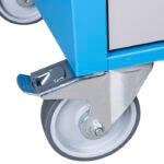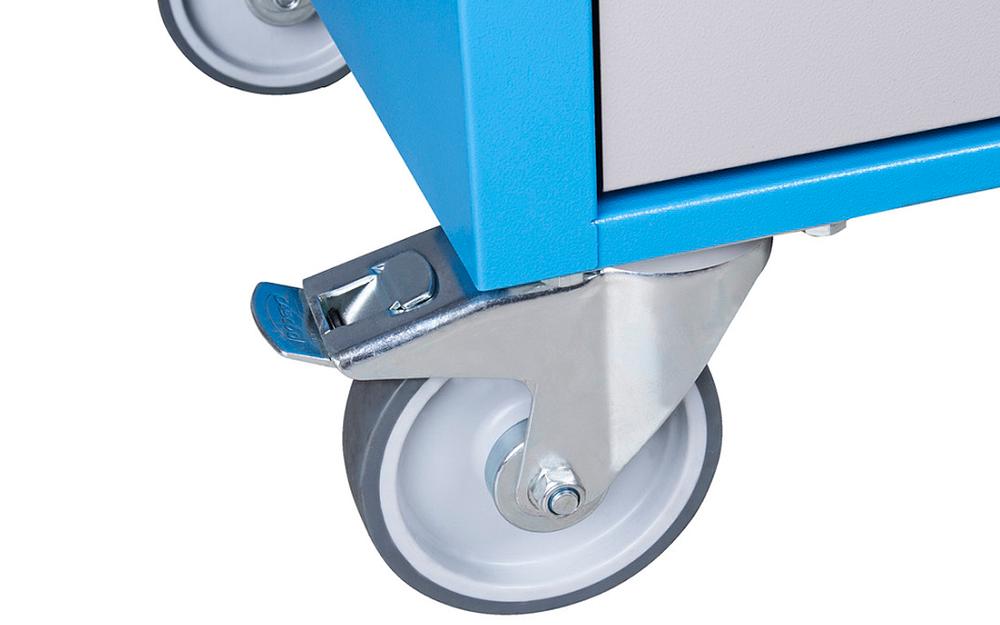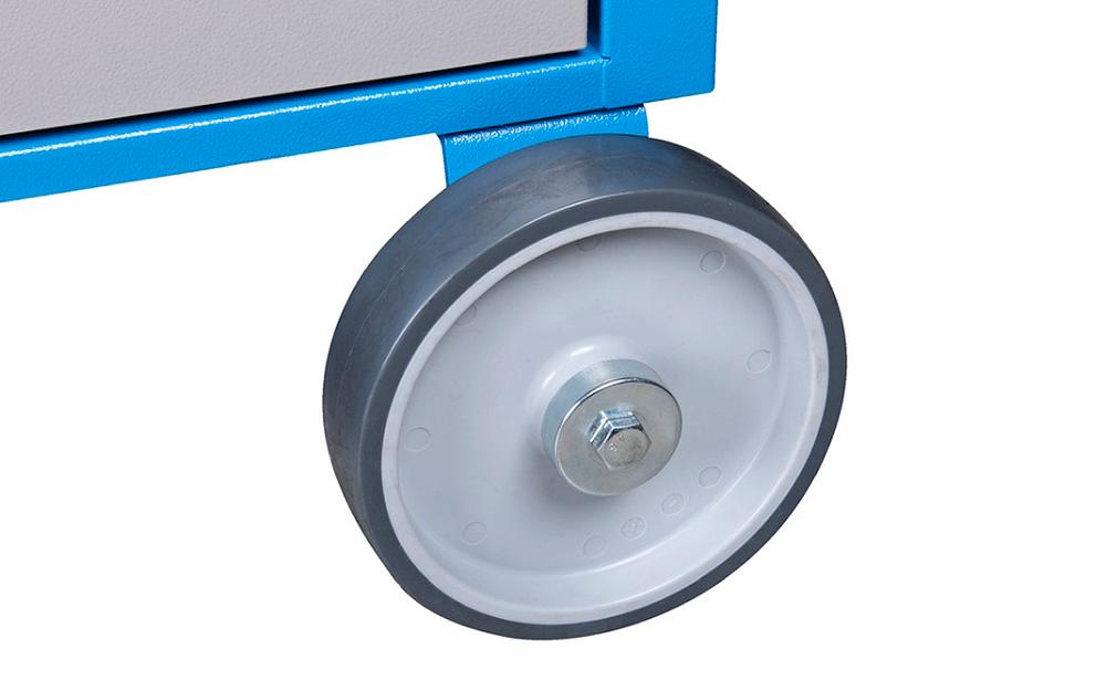 oil and acid resistant casters of a diameter of 160mm, two with brake, which blocks spinning and swiveling of the caster, fixed custers of diameter 200mm
