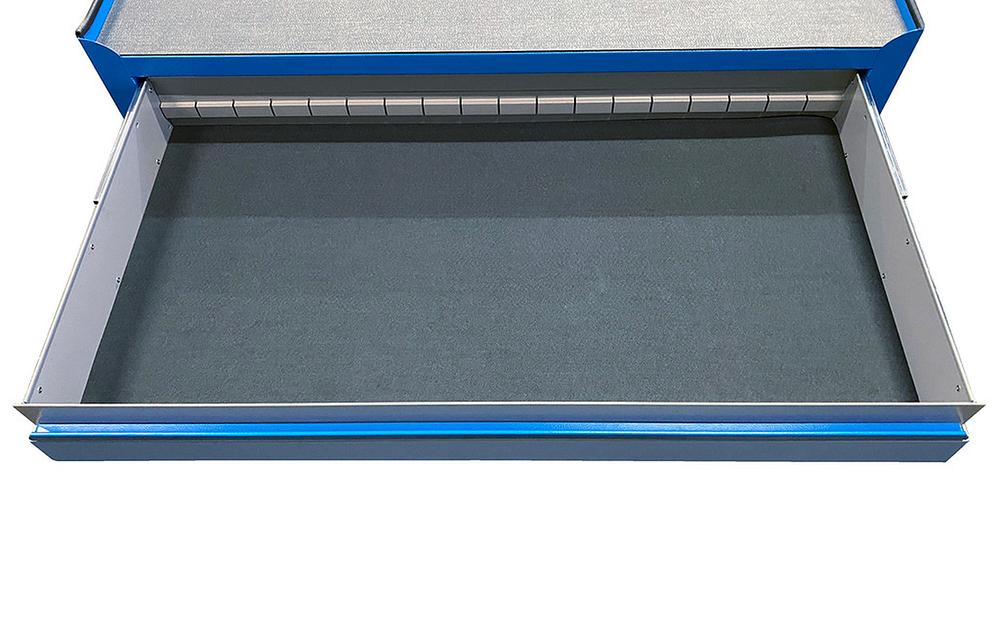 The increased depth of the top drawer enables to store all sockets, including long sockets, in an upright position. This gives maximum space efficiency and increases the number of tools that can be stored in the drawer compared to traditional shallow drawers. In an upright position can be stored all tools in larger dimensions till maximum height of 110mm.