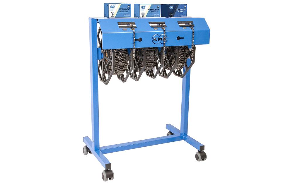 Ietilpst 3 ķēdes ruļļi un 3 Missing Link kastes. Tā 4 spēcīgie ritentiņi ļauj to pārvietot un novietot pat tad, ja tas ir pilnībā uzkrāts. Stabils tērauda plaukts, magnētisks kronšteins ķēžu galam, mobils un regulējams augstums, izmēri: 90 x 60 x 40 cm