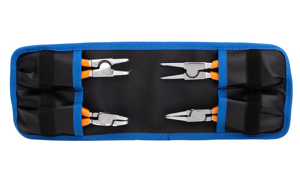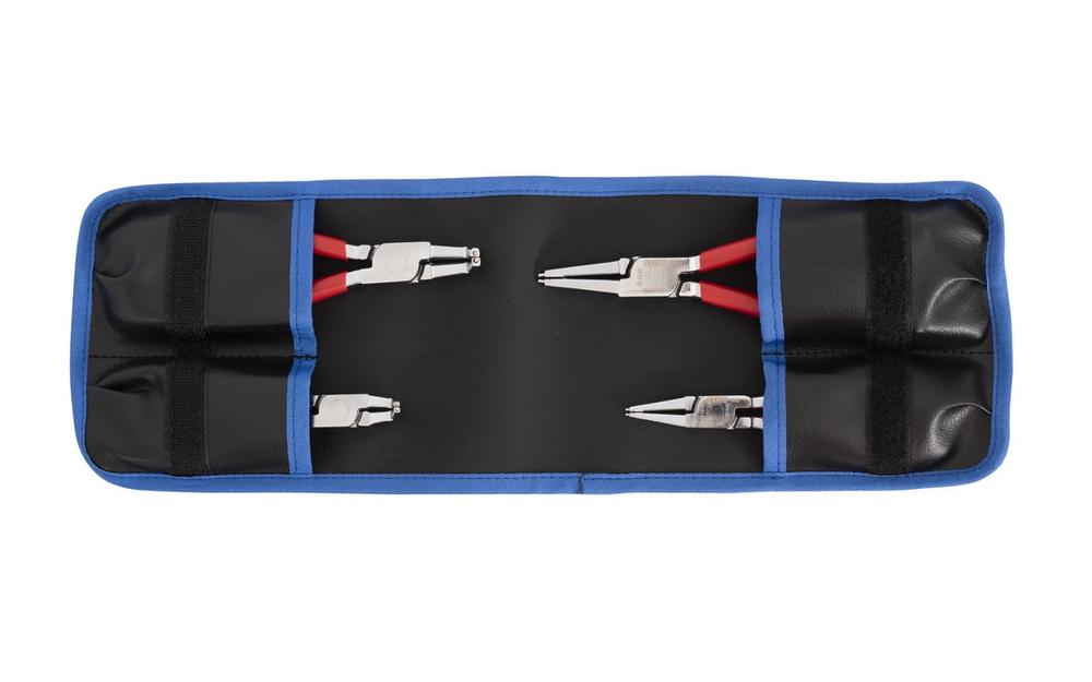 Bloķēšanas riņķu knaibles maisiņā, 4 gab. komplektā. Iekšējo bloķēšanas gredzenu knaibles, taisnas: 140×12 – 25, 180×19 – 60. Iekšējo bloķēšanas gredzenu knaibles, liektas: 140×12 – 25, 180×19 – 60.