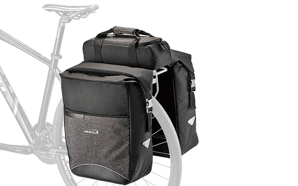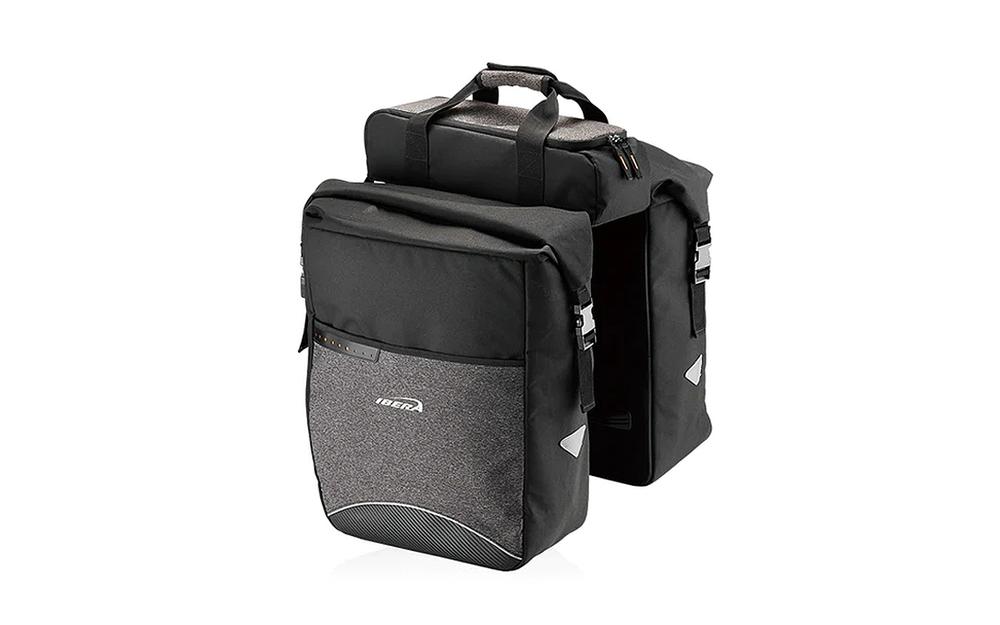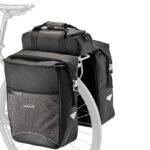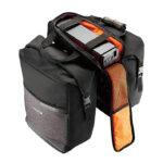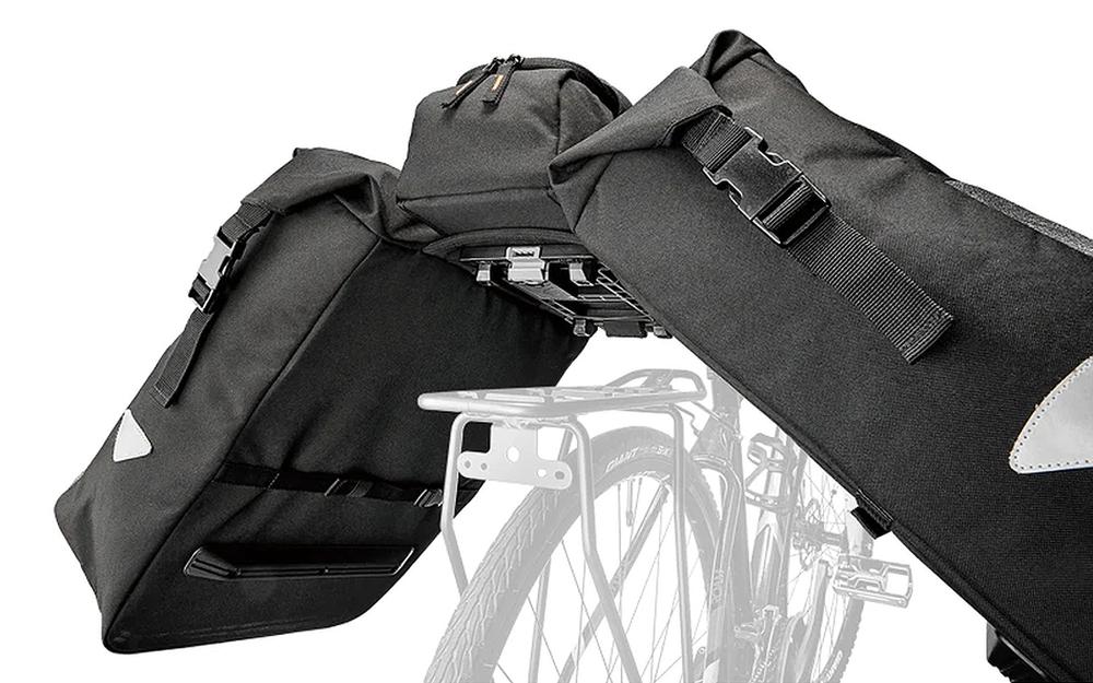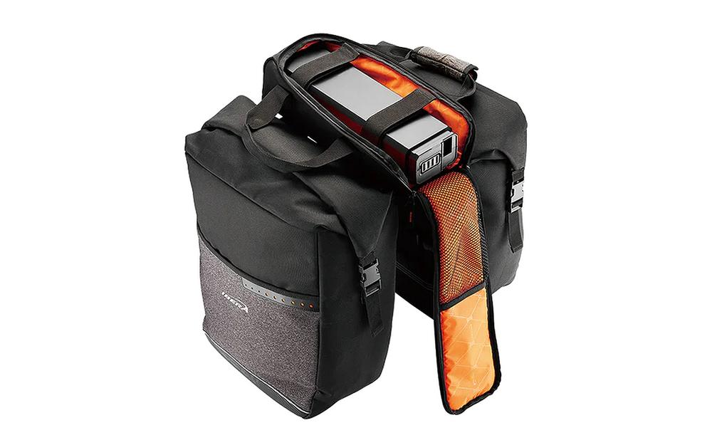 Ar klipšu sistēmu stiprināšanai uz MIK saderīgiem aizmugurējiem turētājiem, iebūvēts E-velosipēda akumulatora turētājs (36,5 x 12,5 x 8 cm), kopējā ietilpība 52,7 l, maksimālā slodze 18 kg, 38 x 16 x 50 cm, materiāls: ūdens izturīgs neilons